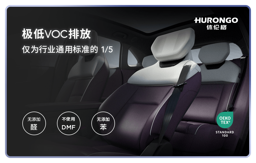 • 安心级呼吸保障: Hurongo休伦格®率先通过OEKO-TEX Standard 100 最高级别 I 级(婴儿产品级)认证。这意味着甲醛、重金属、致癌染料等有害物质都被有效隔绝。其VOC排放量仅为行业通用标准的1/5,让清新空气,成为座舱的底色。