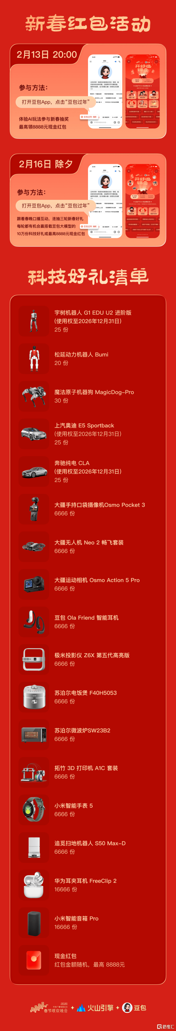 从目前公布的红包规则来看,今年豆包新春活动有两个亮点:一是简单直接,互动玩法门槛低,用户可直接领取红包;二是形式新颖,除基础红包外,科技礼包品类丰富,覆盖了从前沿科技到日常家居的多元场景,将线上互动进一步延展为线下可感知的实体科技体验。