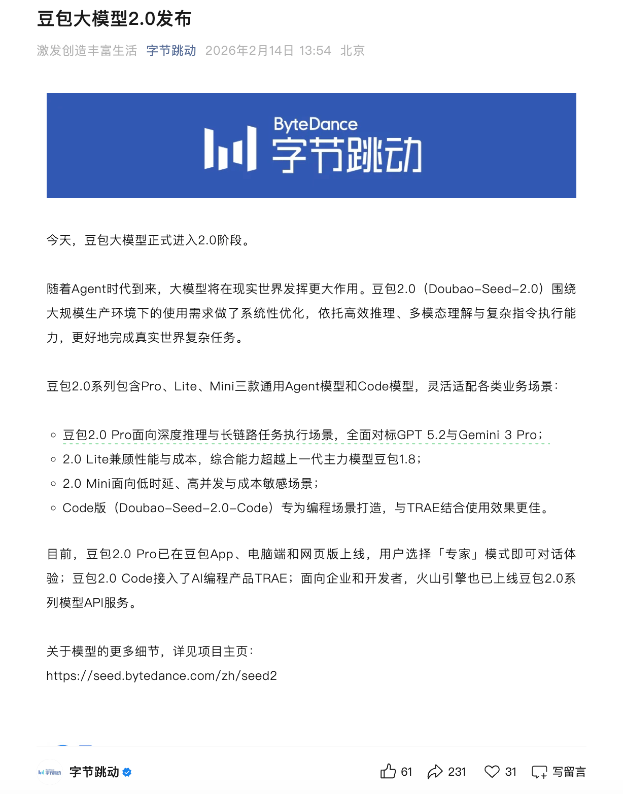 凤凰网科技讯 2月14日,字节跳动宣布豆包大模型2.0发布,包含Pro、Lite、Mini三款通用Agent模型和Code模型,该系列围绕大规模生产环境使用需求进行系统性优化,旨在提升多模态理解、复杂指令执行及长程任务处理能力。