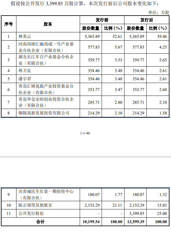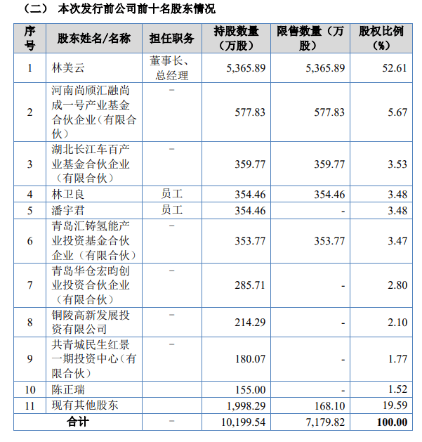 IPO后,林美云持股比例为39.46%,河南尚颀汇融尚成一号产业基金合伙企业(有限合伙)持股比例为4.25%,湖北长江车百产业基金合伙企业(有限合伙)持股为2.65%,林美云胞弟持股比例为2.61%。
