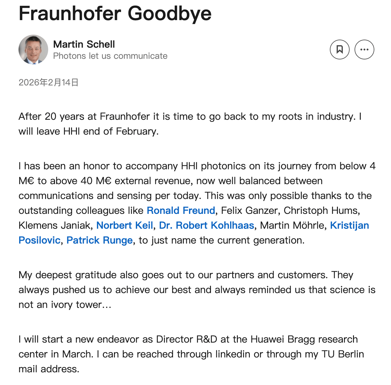 谢尔上个月在领英上宣布,他已辞去弗劳恩霍夫协会旗下顶级光学研究机构海因里希赫兹研究所(Fraunhofer HHI)所长一职,并从今年3月起出任华为英国布拉格研究中心的研发总监。谢尔还曾担任柏林工业大学的光学与光电子集成讲席教授,直到今年3月。