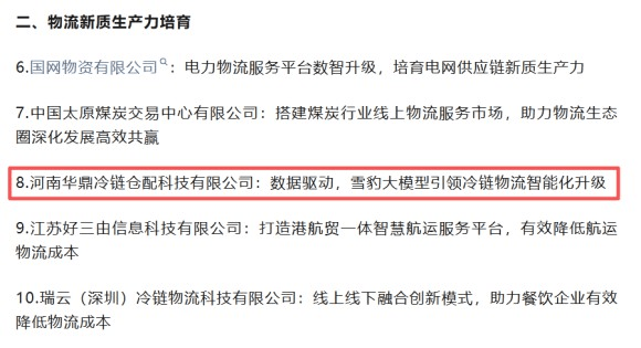 雪豹大模型驱动冷链降本增效 华鼎冷链科技获评全国典型示范案例